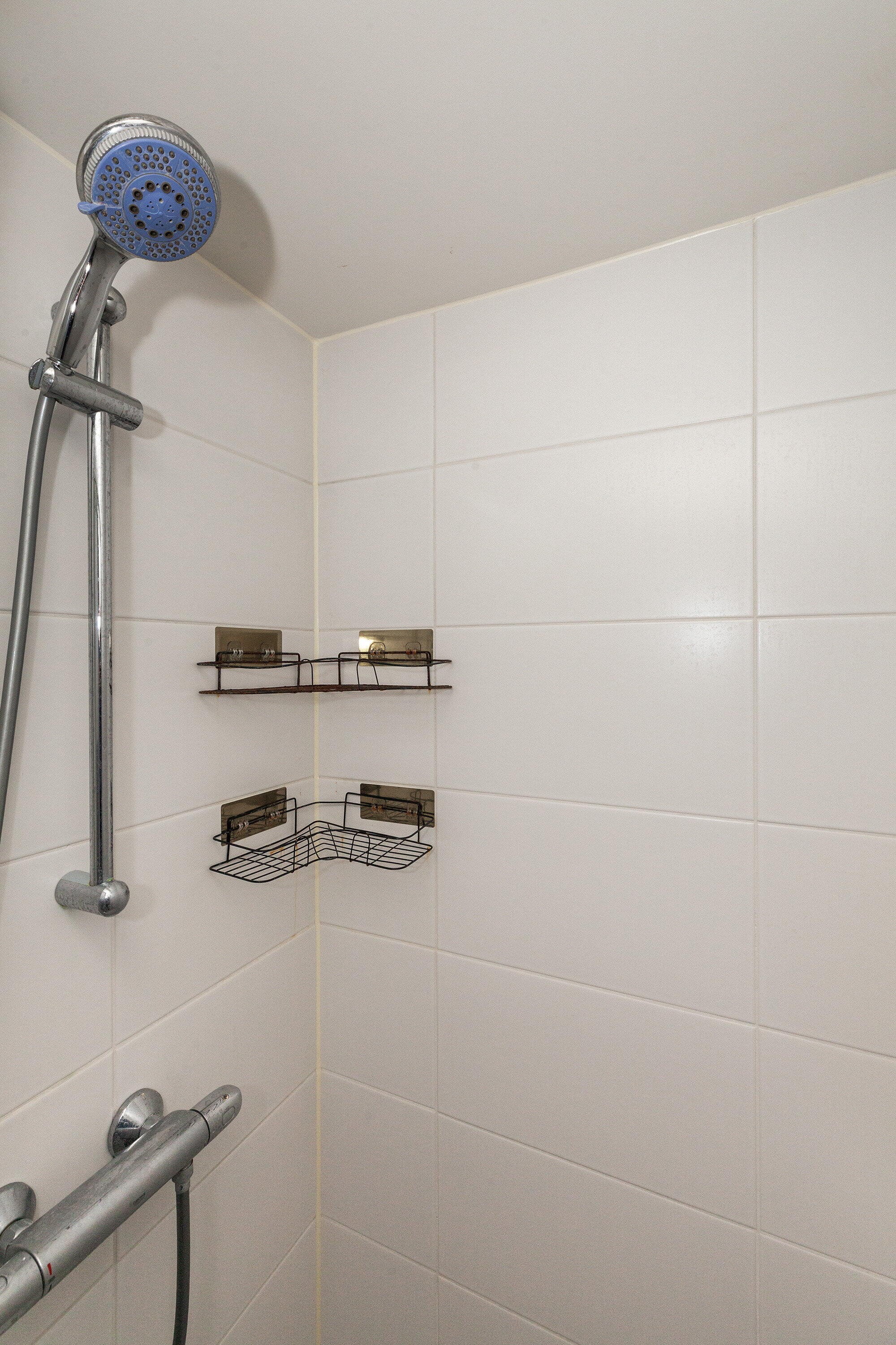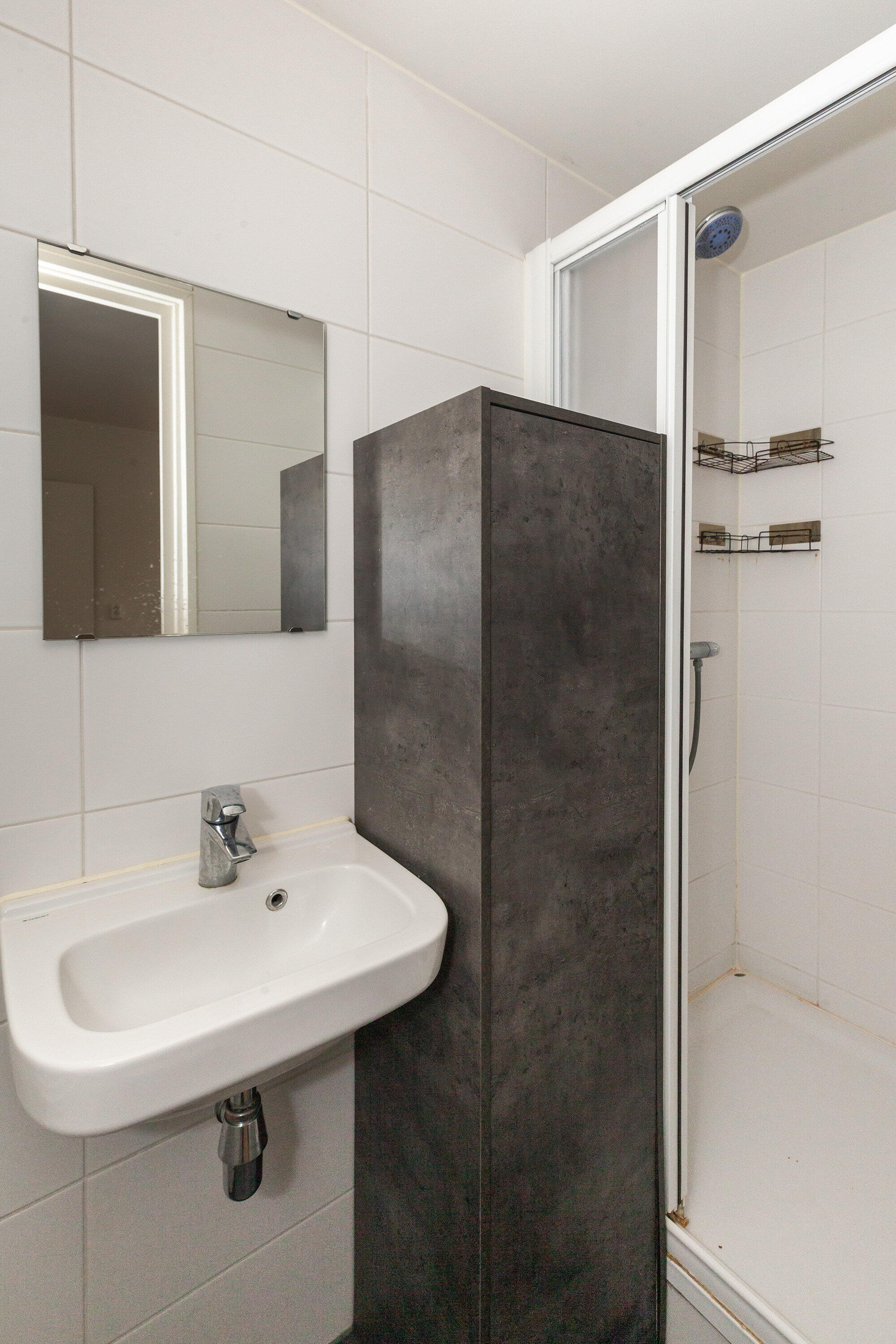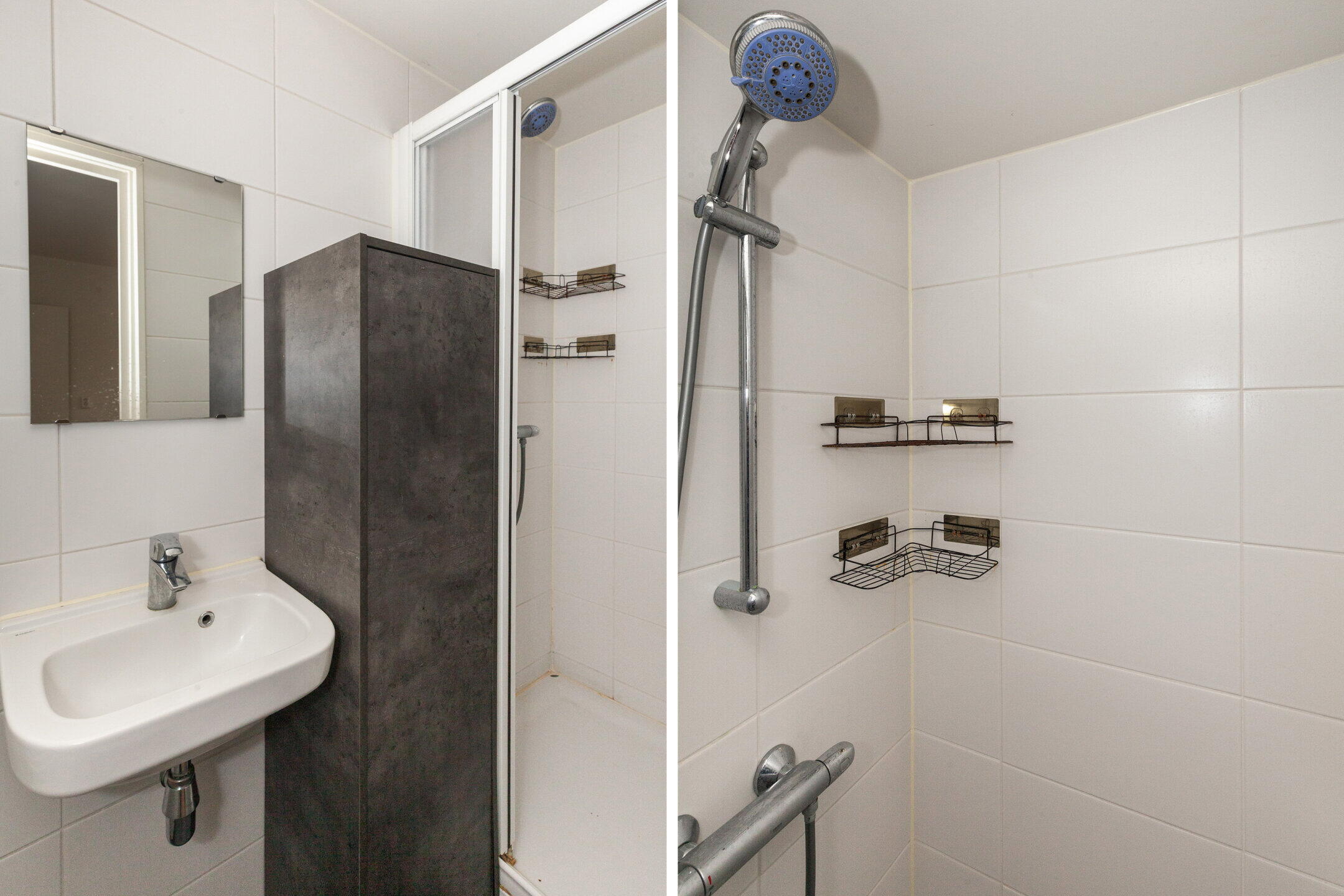 De badkamer is in 2020 vernieuwd en voorzien van een douchecabine, wastafel en opbergkast.