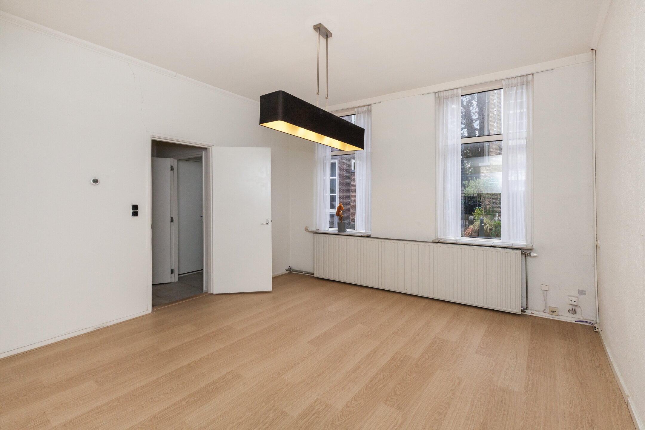 De ruime lichtvriendelijke woonkamer met hoog plafond is voorzien van laminaatvloer, glad gestuukte wanden en plafond.